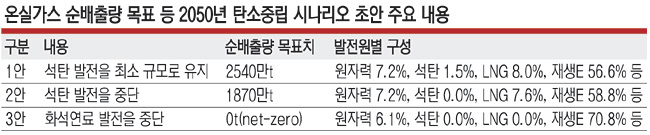 이날 ‘2050 탄소중립위원회’가 발표한 시나리오 초안은 총 3개의 안으로 구성됐다. 석탄 발전을 최소 규모로 유지하는 1안의 경우 2050년 온실가스 순배출량 목표치를 2540만t으로 잡았다. 2안은 석탄 발전을 중단하는 내용으로, 2050년 온실가스 순배출량 목표치는 1870만t이다. 3안의 경우 화석연료 발전을 모두 중단해 2050년 온실가스 순배출량을 0t으로 하는 내용이다. 윤순진 위원회 공동위원장은 이날 화상으로 진행한 브리핑에서 “위원회는 탄소중립 시나리오의 비전을 ‘기후위기로부터 안전하고 지속가능한 탄소중립 사회’로 설정하고 책임성, 포용성, 공정성, 합리성, 혁신성 등 5가지 원칙에 입각해 시나리오를 검토했다”고 말했다. 위원회는 발전 방법의 ‘전환’을 통해 2018년 총 2억6960만t의 온실가스 배출량을 최소 82.9%에서 최대 100%까지 감축한다는 계획이다. 구체적으로는 1안의 경우 4620만t, 2안은 3120만t, 3안은 0t까지 감축한다. 발전원별 구성을 보면 1~3안 모두 원전을 통한 발전은 6∼7%대 비중으로, 23% 수준인 현행 비중의 3분의 1 이하에 그쳤다.