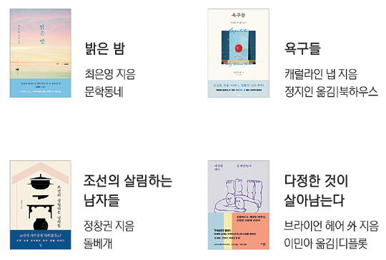 문화일보·예스24 공동 기획 ‘국민 서평 프로젝트 - 읽고 쓰는 기쁨’ 3차 서평 공모 대상이 되는 ‘이달의 책’은 ‘밝은 밤’과 ‘욕구들’, ‘조선의 살림하는 남자들’, 다정한 것이 살아남는다’ 등 4권이다.