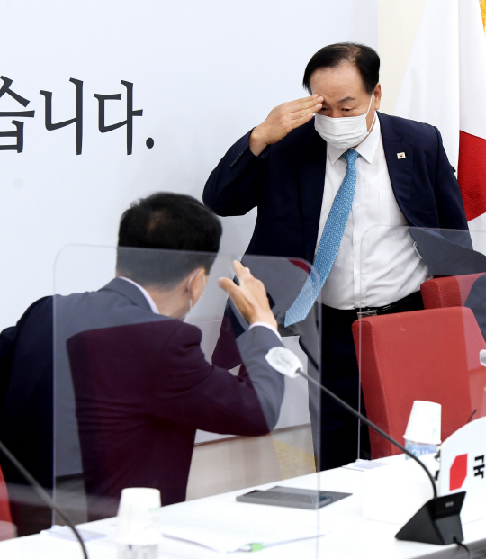 3성장군 출신의 국민의힘 한기호(오른쪽)사무총장이 12일 오전 국회에서 열린 최고위원 간담회에서 김기현 원내대표와 거수경례로 인사하고 있다.