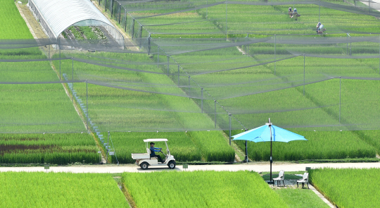 입추(7일)가 지나며 벼 이삭이 여물어 가는 11일 대구 북구 학정동 경북농업기술원 시험재배 볏논 위에 새떼의 피해를 막아주는 그물망이 설치돼 있다.