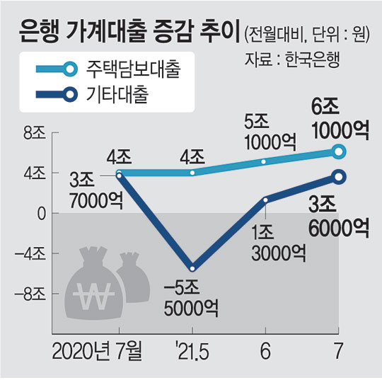 한국은행에 따르면 7월 말 기준 가계대출 잔액은 1040조2000억 원으로, 7월에만 9조7000억 원이 늘었다. 7월 증가액 기준으로 역대 최대치다. 공모주 청약에 따른 자금 수요가 늘면서 대출을 받아 공모주 청약에 들어간 사람도 급증했다.