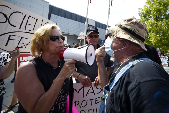 미국 조지아주 매리에타의 코브 카운티 교육위원회 본부 앞에서 12일 마스크 착용에 찬성하는 시위대(오른쪽)가 반대하는 시위대(왼쪽)와 설전을 벌이고 있다. 조지아주에선 지난 9일 코로나19 일일 신규 확진자가 5700명에 육박하면서 6개월여 만에 최고 신기록을 경신했고, 교육 당국은 초등학교 5학년생 수업을 대면에서 원격으로 전환했다.