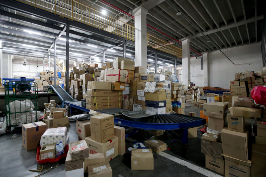 지난해 택배 기사들의 휴식을 위해 만든 ‘택배 없는 날’을 두 번째로 맞은 16일 오후 서울 시내 한 택배 물류센터에 물건이 가득 쌓여 있다.
