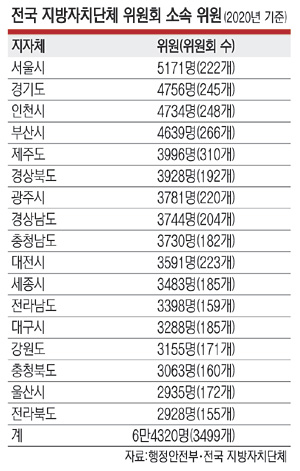 19일 행정안전부와 전국 지자체 등에 따르면 지난해 말 기준 17개 시·도에 설치 운영되는 3499개 위원회에 속한 위원은 6만4320명이다. 이 중 222개 위원회를 운영하는 서울시가 5171명의 위원을 두고 있다. 제주도는 310개 위원회에 3996명의 위원을 위촉했다. 제주도보다 상대적으로 위원회 수가 적은 서울시의 위원 수가 이처럼 많은 것은 그만큼 인력 풀(POOL)이 두텁기 때문으로 분석된다.