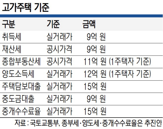 대출과 부동산중개수수료의 고가주택 기준도 제각각이다. 주택담보대출의 경우 주택의 실거래가가 15억 원을 초과하면 대출이 불가능하다. 중도금 대출은 분양가가 9억 원을 넘으면 받을 수 없다. 부동산 중개수수료 최고요율(0.9%)이 적용되는 집값도 오는 10월 중 실거래가 9억 원 이상에서 15억 원 이상으로 바뀔 예정이다.