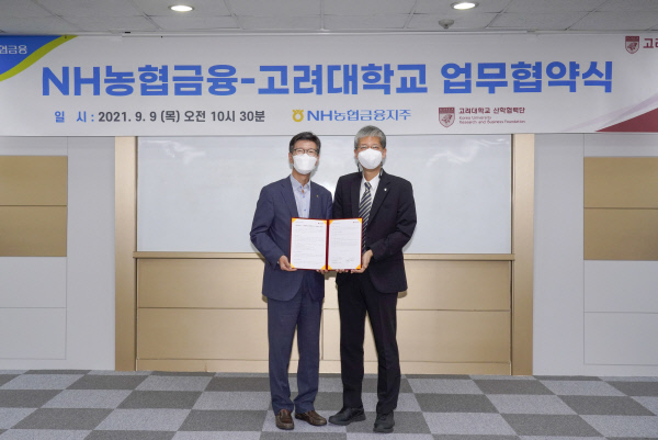 농협금융지주는 농협금융 디지털 전환(DT) 추진을 위한 인공지능(AI) 공동연구 및 디지털 인재 양성을 위해 고려대 산학협력단과 업무협약(MOU)을 체결했다고 10일 밝혔다. 지난 9일 서울 성북구 고려대 안암캠퍼스에서 진행된 협약식에는 이상래(사진 왼쪽) 농협금융지주 디지털전략 부문장과 조석주(〃 오른쪽) 고려대 산학협력단장 등이 참석했다.