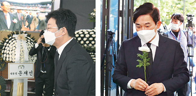 국민의힘 대선 주자인 유승민(왼쪽 사진) 전 의원과 원희룡 전 제주지사가 15일 오전 서울 여의도순복음교회에 마련된 고 조용기 원로 목사의 빈소로 들어가고 있다.