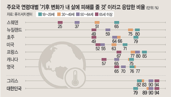 젊은층이 이 같은 전 세계적 인식 변화를 선도하고 있다. 10대 기후활동가 그레타 툰베리의 고향인 스웨덴에선 18~29세 젊은층이 기후 변화를 우려하는 정도(65%)가 65세 이상 노년층(25%)보다 40%포인트나 높게 나타났다. 뉴질랜드(31%포인트)·호주(30%포인트)·싱가포르(20%포인트)·미국(19%포인트) 등에서도 연령대별 인식 차가 뚜렷했다. 특히 청년 10명 중 4명은 기후 위기를 이유로 아이를 낳는 것조차 망설이고 있다. 국제시민운동단체 아바즈가 자금을 대고, 영국 바스대 등 7개 대학 및 협회가 공동으로 수행한 연구에서 10개국 16~25세 청년 1만여 명 중 75%는 “미래가 무섭다”고 답했고, 56%는 “인류가 멸망할 것”이라고 했다.