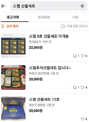16일 스팸 선물세트 등은 당근마켓 등의 매물로 다량으로 올라왔다. 스팸 선물세트의 가격대는 3만∼4만 원대지만 당근마켓에서는 약 60% 저렴한 2만∼2만5000원에서 거래되고 있다.