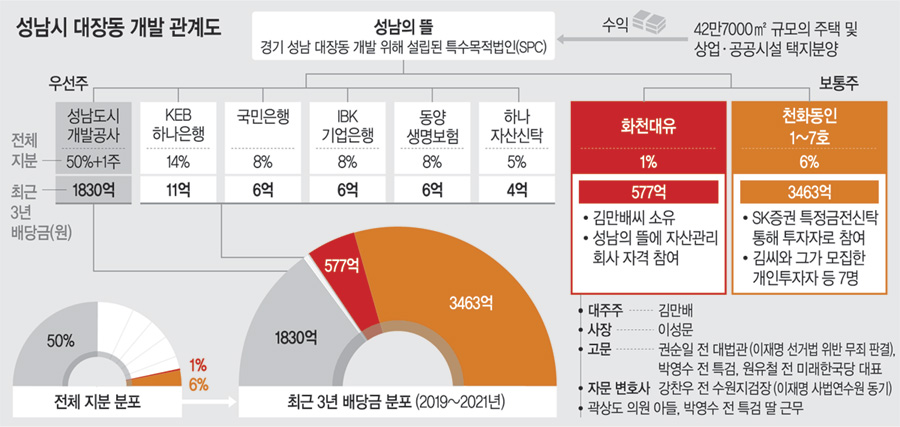 국민의힘 ‘이재명 판교 대장동 게이트 진상조사특위’ 위원인 윤창현 의원은 23일 문화일보와의 통화에서 “(성남의뜰) 우선주가 93%, 보통주가 7%인데 93%에는 한도가 정해져 있고, 남은 돈을 7%가 다 가져갔다”며 “1조 원 넘는 규모의 사업을 하는 데 3억5000만 원을 출자한 사람들에게 이만큼의 기회를 준 것 자체가 상당히 문제가 있다”고 비판했다. 통상적인 수익배분 구조에서 우선주와 보통주 배분이 6 대 4, 7 대 3인 것과 비교해서도 상당히 이례적이라는 지적이다.