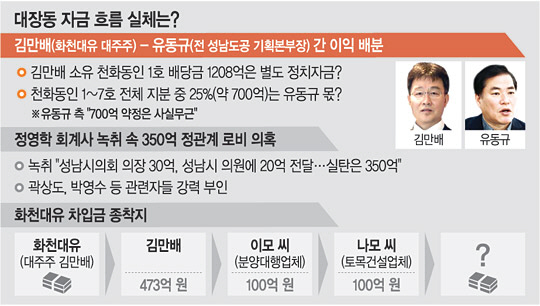 녹취에 담긴 것으로 전해진 “실탄 350억 원” 발언도 개발 이익이 정치자금으로 흘러갔다는 의혹을 키우고 있다. 해당 발언에는 성남시의회 의장과 의원에게 각각 30억 원, 20억 원을 전달했다는 내용도 담겨 있다. 이에 녹취에 언급된 ‘실탄’은 개발 과정에 관여하거나 관여할 수 있는 위치에 있었던 정치인일 거라는 분석이다. 김 씨가 화천대유에서 빌린 473억 원의 행방도 검찰 수사로 드러나야 할 부분이다. 김 씨는 이 중 100억 원을 분양대행업체 이모 대표에게 빌려줬다. 이 대표는 전액, 토목건설업체 나모 대표에게 건넸다. 이 대표는 나 대표에게서 받은 20억 원을 갚는 목적 등으로 김 씨에게 100억 원을 빌려 전달한 것으로 알려졌다. 일각에선 법인 간 차입금 상환과 투자 등의 목적으로 ‘둔갑’, 대장동 개발 이익이 정치자금으로 흘러갔을 거라는 의혹도 일고 있다.