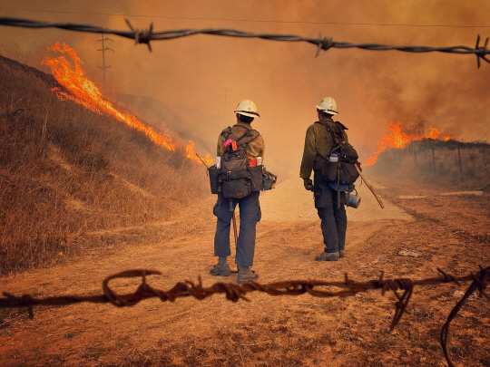방화선 설정을 전담하는 소방대원들이 12일 캘리포니아주 샌타바버라 카운티에서 산불을 바라보고 있다. ‘앨리살’이라는 이름이 붙은 산불은 최대 시속 56㎞ 강풍을 타고 빠르게 번지면서 현재 초지 23㎢를 태웠고, 이 때문에 태평양 연안의 101번 고속도로 일부 구간이 폐쇄됐다.