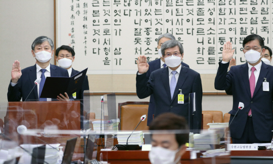 15일 오전 국회에서 열린 법제사법위원회의 국정감사에서 김광태(앞쪽 왼쪽부터) 서울고등법원장과 배기열 서울행정법원장, 정종관 수원고등법원장이 증인선서를 하고 있다.