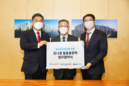 포니정재단은 보호종료예정아동 또는 보호종료아동(자립준비청년)에 대한 원활한 장학사업 진행을 위해 한국아동복지협회와 ‘포니정 발돋움장학 업무협약식’을 진행했다고 밝혔다. 지난 12일 협약식에서 김종수(가운데) 포니정재단 고문이 신정찬(왼쪽) 한국아동복지협회 회장, 김덕산 한국공익법인협회 이사장과 기념촬영을 하고 있다. 협약에 따라 포니정재단은 자립준비청년에게 2년간 직업훈련비 최대 1200만 원과 생활비 760만 원을 지원하는 등 다양한 프로그램을 운영한다.