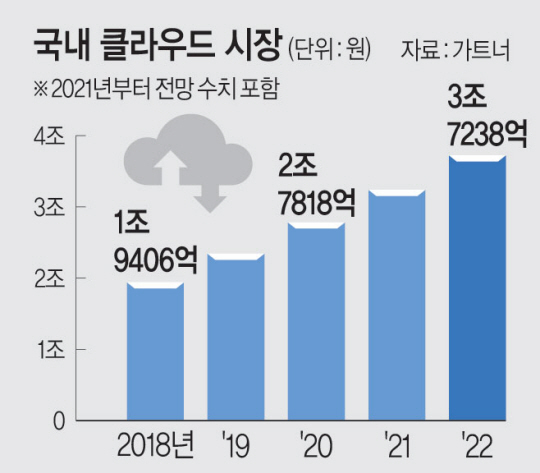 ◇국내 클라우드 시장 급성장…내년 4조 원 전망도 = 이 같은 흐름에 힘입어 국내 클라우드 시장은 가파르게 성장하고 있다. 글로벌 IT 리서치 기업인 가트너에 따르면 2018년 1조9406억 원 수준이던 국내 클라우드 시장은 올해 3조2400억 원까지 성장했다. 가트너는 국내 클라우드 시장이 매년 평균 14% 성장하고 있으며 내년에 약 3조7238억 원에 이를 것으로 예측했다. 업계에서는 내년 4조 원 돌파도 가능하다고 내다보는 상황이다. 업계는 전 세계 클라우드 시장이 2020년 2700억 달러(약 317조3000억 원)에서 올해 3323억 달러(390조5000억 원)로 23% 성장한 점에 비춰볼 때, 향후 관련 기업·산업의 급성장을 예상한다.