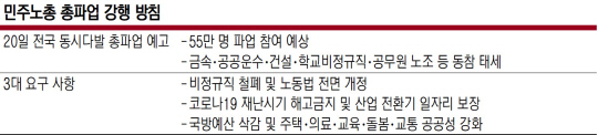 민주노총이 오는 20일 최대 55만 명이 참여하는 대규모 총파업을 강행키로 함에 따라 전국 산업·공공 현장에 긴장감이 높아지고 있다. 경영계는 총파업 방침을 철회하고 전 국민적인 일상 및 경제 회복 노력에 민주노총이 동참해야 한다고 긴급 성명을 발표했다.