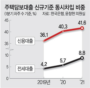 주택담보대출(주담대)과 함께 신용대출·전세자금대출을 받고 있는 이중채무자의 비중이 역대 최대 수준에 달한 가운데 금리가 오르면서 앞으로 이자 증가가 경제에 큰 부담이 될 수 있다는 우려가 커지고 있다.