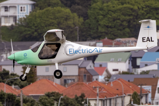 일렉트릭에어사의 소형 전기 비행기가 뉴질랜드 웰링턴 공항에 착륙하기 위해 하강하고 있다. 뉴질랜드의 조종사 개리 프리드먼은 친환경 비행의 가능성을 보여주기 위해 최초로 이 비행기를 이용해 쿡 해협 상공을 비행했다.
