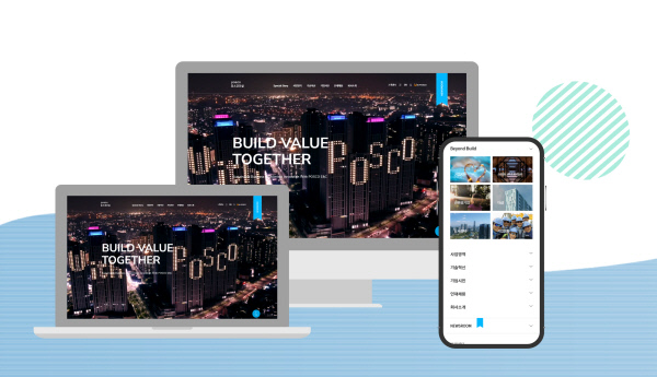 ‘뉴스룸’은 보도자료와 언론에 비친 포스코건설의 모습, SNS 채널(유튜브, 인스타그램)의 대표 콘텐츠들을 한 공간에 담았다. 채용 코너는 실제 현업에 종사하고 있는 직원들이 인터뷰 형식으로 본인의 직무를 소개한다. 고객들이 사용하는 디바이스에 특화된 화면을 구성했고, 영상과 이미지 비중을 대폭 늘려 하나의 웹 매거진 형태 홈페이지를 만들었다고 포스코건설은 설명했다.