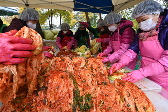 10일 오전 서울 송파구 서울놀이마당에서 열린 사랑의 김장나눔 행사에 참여한 새마을부녀회 회원들이 관내 저소득층 가정에 전달할 김치를 버무리고 있다.
