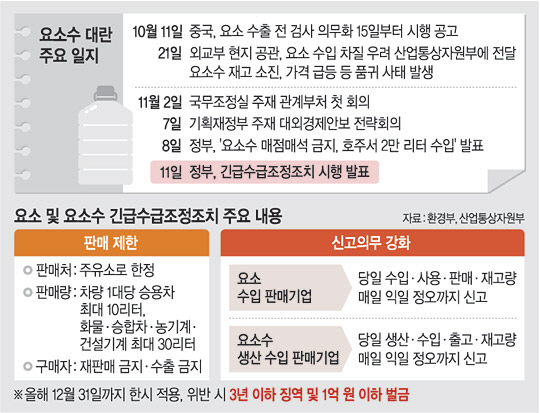 정부가 11일부터 요소·요소수 유통망 관리를 위한 긴급수급조정조치를 시행하면서, 요소와 요소수를 수입·생산·판매하는 기업은 하루 실적 관련 정보를 다음 날 정오까지 의무 신고해야 한다. 아울러 요소수가 필요한 국민이나 화물차 운전사는 승용차와 화물차 1대당 각각 최대 10ℓ, 30ℓ 초과해 구매할 수 없게 됐다. 승용차는 최대 반년까지 사용할 수 있는 양이지만, 중대형 화물차(1.5t 이상)는 1500㎞ 주행 분량이며, 25t 기준 대형 화물차로 적용하면 300㎞ 주행에 그친다.