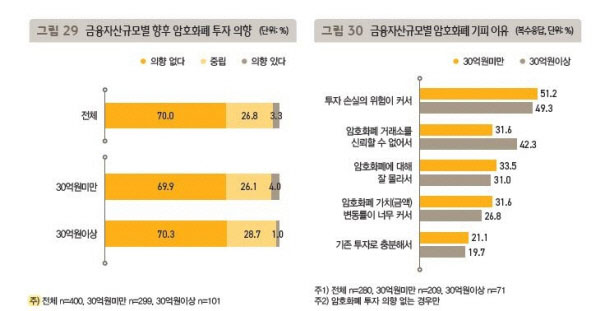 가상화폐 투자를 꺼리는 이들의 절반가량은 ‘투자 손실 위험이 크다’는 점을 기피 이유로 지적했다. 다음 요인으로 금융자산 30억 원 이상 부자는 ‘가상화폐 거래소를 신뢰할 수 없어서’(42.3%)를, 금융자산 30억 원 미만 부자는 ‘가상화폐에 대해 잘 몰라서’(33.5%)를 각각 꼽았다. 연구진은 “부자들은 대체로 보유 자산을 적극적으로 운용해 수익을 추구하는 방식을 선호한다”며 “가상화폐는 위험률이 감당할 수 있는 범위를 넘어서고, 거래 신뢰성에 의문이 제기돼 매력을 느끼지 못하는 것”이라고 분석했다.