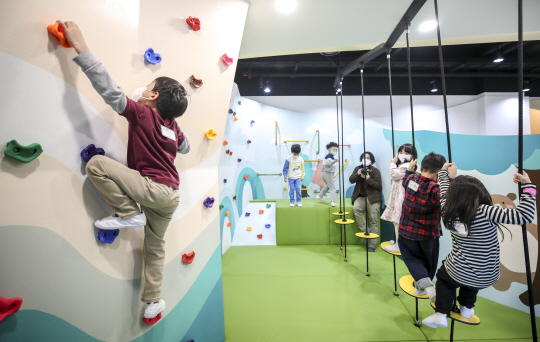 16일 서울 서초구 ‘방배 SMART 서리풀노리학교’에서 어린이들이 체육 활동을 하고 있다. 정보통신기술(ICT)을 접목한 공공형 실내놀이터인 서리풀노리학교는 2주간 어린이집 원아 등을 대상으로 시범운영한 뒤 12월 1일 정식 개관할 예정이다.