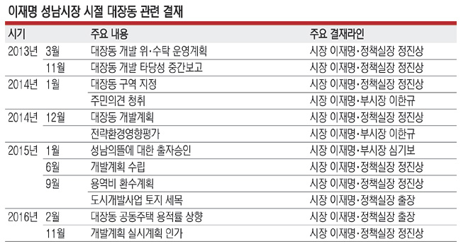 23일 문화일보 취재를 종합하면, 대장동 개발 사업이 진행되던 2013년부터 2016년 말까지 이 후보가 개발 입안·수립부터 실시계획 인가 등 사업 전반을 보고받고 승인한 공문은 최소 12개에 달한다. 이 후보의 최측근 정진상 민주당 선거대책위원회 비서실 부실장(전 성남시 정책실장) 또한 주요 결재 라인에 포함돼 최소 7개 공문에 직접 서명했다.