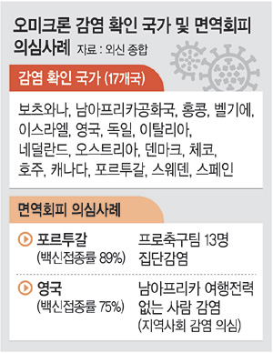 코로나19 신종 변이 ‘오미크론’ 감염 사례가 포르투갈과 스페인, 스웨덴에서도 나오면서 총 17개국으로 확산했다. 유럽에서는 오미크론이 처음 발견된 남아프리카 지역을 다녀오거나 다녀온 사람과 접촉한 적도 없는 사람들의 오미크론 감염 사례가 나오면서 지역사회 감염도 이미 시작된 것 아니냐는 우려도 커지고 있다.
