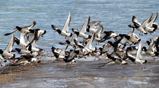 1일 경남 남해군 고현면 바닷가에서 먹이활동을 하던 검은머리물떼새 무리가 날아오르고 있다. ‘갯벌의 신사’로 불리는 검은머리물떼새는 천연기념물 제326호로 지정됐다.