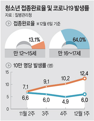 특히 백신 접종 완료 비율이 낮은 중학교와 초등학교 학생 확진자 발생률이 지속적으로 높아지고 있다. 중학교는 10만 명당 확진자가 11월 1주 7.7명에서 11월 5주 10.6명으로 늘었다. 초등학교도 같은 기간 5.7명에서 10.3명으로 높아졌다. 현재 고3 접종 완료율은 97%에 달하지만 10월 접종을 시작한 16~17세는 접종률이 아직 64.0% 정도고, 11월부터 접종을 시작한 12~15세는 접종 완료율이 13.1%에 불과하다.