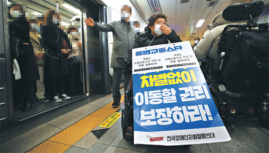 전국장애인차별철폐연대 관계자들이 7일 오전 서울 혜화역 승강장에서 교통약자 이동편의 증진법 연내 개정을 촉구하는 1인 시위를 벌이고 있다.
