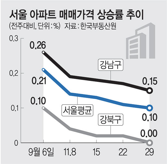 서울 외곽 지역 아파트의 매매가격 둔화는 통계로도 확인할 수 있다. 한국부동산원의 11월 다섯째 주(29일 기준) 주간동향을 보면 금·관·구(금천·관악·구로구)와 노·도·강 6개 지역 중 구로구(0.11%)만 빼고 모두 서울 평균 상승률(0.10%)을 밑돌았다.