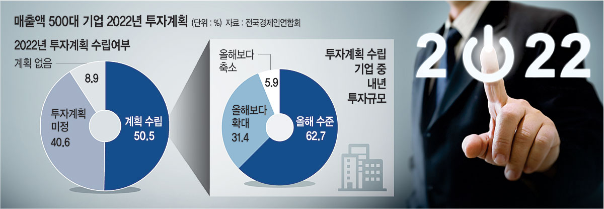 ◇응답 기업 49.5%, ‘계획 없거나, 못 세워’= 한국경제연구원은 여론조사기관 모노리서치에 의뢰해 매출액 기준 500대 기업을 대상으로 ‘2022년 투자계획’을 조사(11월 22일~12월 2일)한 결과, 응답 기업(101개 사)의 49.5%가 ‘내년도 투자 계획이 없다’(8.9%)거나 ‘아직 계획을 세우지 못했다’(40.6%)고 응답했다고 13일 밝혔다. 내년 투자계획을 세운 기업은 50.5%로, 이 중 절반 이상(62.7%)은 내년 투자를 올해 수준으로 유지할 계획인 것으로 파악됐다. 올해보다 늘리겠다는 기업은 31.4%, 줄이겠다는 기업은 5.9%였다.