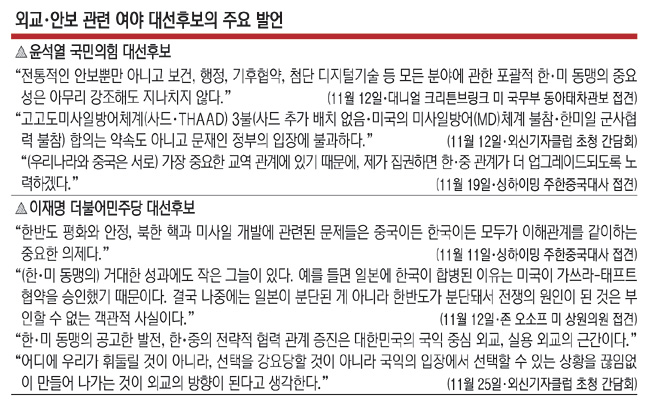 ◇구호만 외치는 후보들 = 이재명 더불어민주당 대선후보는 한·미 동맹 발전과 한·중 전략적 협력관계 증진을 나란히 놓고 그때그때 실용외교를 펼친다는 구상이다. 윤석열 국민의힘 대선후보는 미·중 갈등 현안을 사안별로 대응할 것이 아니라 한·미 포괄적 전략동맹 강화를 통해 중국 문제도 풀어나가겠다고 강조한다. 전문가들은 양 후보의 외교전략에 구체적인 실천 방안이 부재함을 지적했다. 박원곤 이화여대 북한학과 교수는 “이 후보는 실용주의를, 윤 후보는 국익 우선주의를 이야기하지만 무엇이 실용적이고 무엇이 국익인지 보다 구체적으로 설명해야 한다”며 “더 개방적이고 자유주의적인 국제질서, 동맹의 중요성과 시장경제, 인권 등을 중시하는 측면에서 원칙을 정하고 그 원칙에 따라 움직이는 모습을 보여야 할 것”이라고 강조했다. 제임스 김 아산정책연구원 연구위원은 “미·중 경쟁이 지역 정세에서 상당히 중요한데 그렇게 여기지 않는 것 같다”며 “현재까지 나온 입장으로만 봐서는 한국이 미·중 경쟁 국면에 크게 동참하겠다는 것도 아니고 동참하지 않겠다는 것도 아닌 수준”이라고 지적했다.