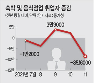 올해 11월 취업자는 전년 동월 대비 55만3000명 늘었다. 취업자 증가 폭이 10월(65만2000명)에 비해 크게 줄었다. 최근 호조세를 보이던 취업자 증가 폭이 꺾인 가장 큰 이유는 11월부터 단계적 일상회복(위드 코로나)이 시행되면서 확진자가 급증하자 대면 서비스업 취업자가 급감했기 때문이다. 11월 숙박 및 음식점업 취업자는 8만6000명 줄면서 3개월 만에 감소세로 돌아섰다. 정부의 방역 조치는 완화됐지만, 방역 실패로 확진자가 폭증하자 음식점이나 주점 방문이 줄었기 때문으로 분석된다.