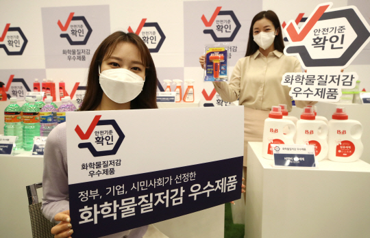 14일 서울 중구 대한상공회의소에서 모델들이 화학물질 저감 우수제품을 선보이고 있다. 이날 공개된 표백제, 세탁세제, 습기제거제, 살균제 등 총 25개의 제품은 화학물질저감 우수제품 심사위원회의 심사를 통과한 제품으로 화학성분에 대한 걱정 없이 사용할 수 있는 생활화학제품이다.