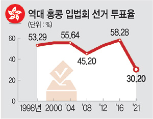 20일 홍콩 RTHK에 따르면 홍콩 선관위는 전날 열린 입법회 선거에서 전체 유권자 447만2863명 중 총 135만680명이 참여해 투표율이 30.2%로 집계됐다고 밝혔다. 이는 1997년 홍콩이 영국에서 중국으로 반환된 이후 최저투표율이었던 2000년의 43.57%보다도 낮다. 홍콩 사우스차이나모닝포스트(SCMP)는 “심지어 39.1%라고 기록된 1991년의 투표율보다도 낮다”며 30년 만의 최저 기록이라고 전했다. 이번 선거는 홍콩의 선거제 개편으로 소위 ‘민주파’로 불리는 반중 인사들이 불참했고, 이들과 해외 망명 민주화 운동가들은 투표 보이콧과 백지투표 운동을 벌여와 당선 결과보다 투표율에 관심이 쏠렸다. 중국 당국이 이례적으로 투표를 독려하고 홍콩은 대중교통 무료 이용과 중국과의 국경지대에 투표소 설치까지 해가며 투표를 독려했지만 결과는 기대를 크게 벗어났다.
