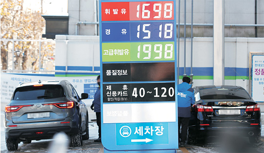 전국 주유소 기름값이 유류세 인하 이후 5주 연속 하락했다. 사진은 19일 서울 시내 한 주유소 전광판에 게시된 유가 정보.