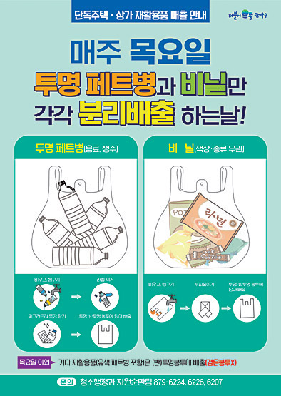 이에 따라 관악구 주민들은 매주 목요일에만 투명페트병과 비닐을 각각 분리해 배출해야 하며, 그 외 재활용품은 목요일을 제외한 다른 요일에 배출해야 한다. 구는 제도 전면 시행 이후 구 홈페이지와 SNS, 구정 소식지, 전광판 등 다양한 매체를 통해 홍보하고 있다. 제도를 위반하고 무단으로 배출된 재활용품은 수거하지 않는다. 분리배출하는 방법은 간단하다. 투명페트병은 내용물을 비우고 라벨을 제거한 후 뚜껑을 닫아 배출해야 하고, 비닐은 이물질을 제거한 후 부피를 줄여 (반)투명 봉투에 담아 배출하면 된다. 주의할 점은 이물질이 묻은 비닐은 재활용이 아닌 일반쓰레기로 종량제 봉투에 담아 배출해야 하고, 모든 재활용품은 검은 봉투가 아닌 속이 보이는 (반)투명 봉투에 담아 배출해야 한다.