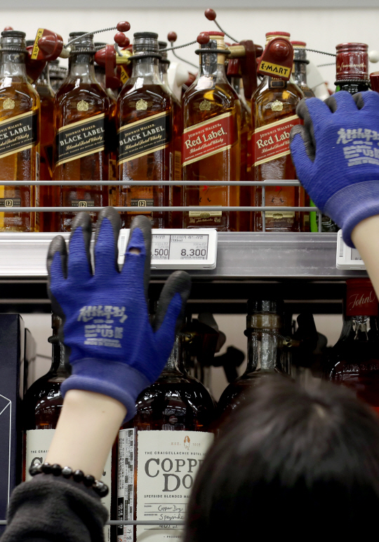 위스키에 음료를 타서 마시는 ‘하이볼’의 인기로 위스키 수입액이 5년 만에 최대를 기록한 가운데 5일 오후 서울 한 대형마트 주류 코너에서 직원이 위스키를 정리하고 있다.