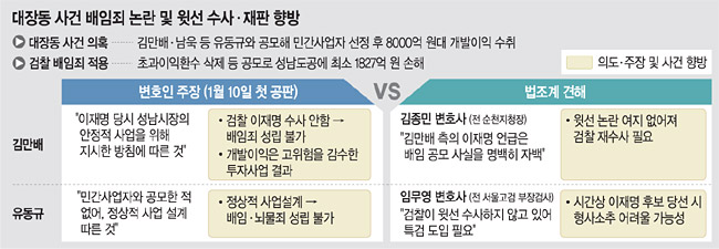 같은 날 이 후보 측은 김 씨 발언에 대해 “이재명 당시 성남시장의 사적 지시가 아닌 ‘성남시 공식방침’”이라고 해명했지만 논란은 수그러들지 않고 있다. 법조계에선 ‘어불성설’이란 비판이 나온다. 검찰 출신 한 변호사는 “대장동 사업을 이 후보가 직접 설계했다고 밝힌 이상 성남시 입장이 시장의 입장과 다르지 않게 된 것”이라며 “배임 혐의를 피하기 위해 말장난을 하고 있다”고 지적했다.