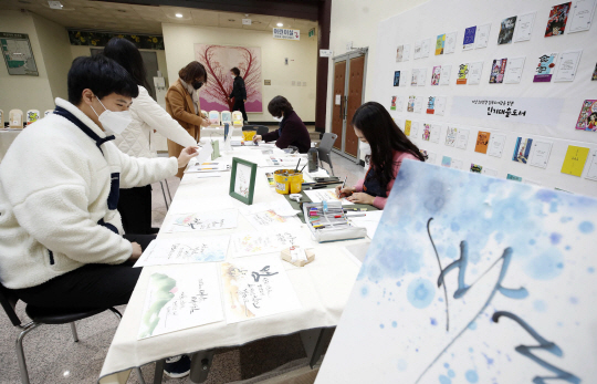 10일 광주 북구 일곡도서관에서 캘리그래피 강사들이 도서관 이용객들에게 새해 소망 문구를 써주고 있다.