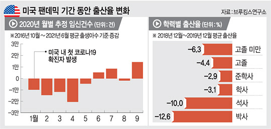 코로나19 팬데믹(세계적 대유행)으로 임신을 포기하거나 미루면서 실제 미국에서 팬데믹 기간 동안 태어난 아기가 예상보다 6만 명 적었던 것으로 나타났다. 불확실성이 커지고 봉쇄 등으로 일상생활이 불가능해졌기 때문이다. 특히 실업률이 높은 지역에서 출생아 수가 줄어들었고 고학력의 30~40대 여성의 출산율도 크게 감소한 것으로 분석됐다.