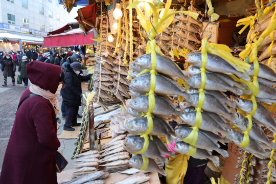 임인년 설(2월 1일) 연휴가 20여 일 앞으로 다가온 가운데 11일 서울 동대문구 청량리농수산물시장에 굴비 등 제수용품이 진열돼 있다.