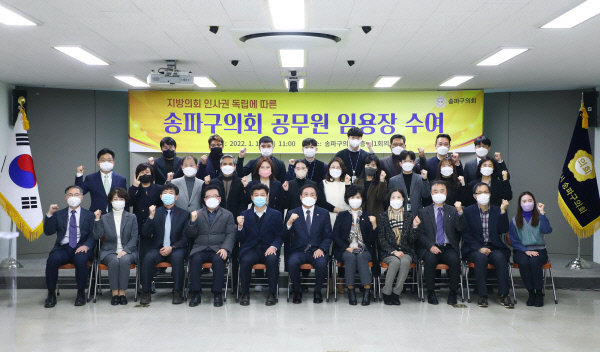 이황수 의장은 직원들에게 임용장을 수여하며 환영 인사를 건넸다. 이날부터 지방의회 의장에게 인사권을 부여하는 지방자치법 개정안이 시행되면서 송파구의회 사무국 직원들의 인사권도 의장이 행사하게 됐다.