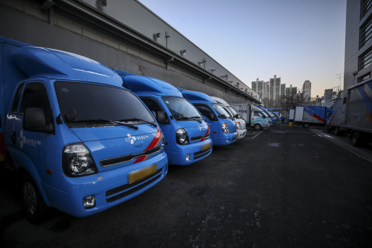 민주노총 전국택배노조 CJ대한통운본부의 파업이 3주째 이어지고 있는 18일 오전 서울의 한 CJ대한통운 물류센터에서 택배 차량들이 줄지어 서 있다.