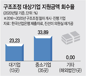 상대적으로 자금 여력이 있을 것으로 보이는 대기업에서 오히려 지원금 회수율이 낮은 점도 지적됐다. 2016~2020년 구조조정이 진행된 대기업은 한진중공업 등을 포함해 13곳이다. 대기업에 지원된 5조7959억 원 중 1조3465억 원을 거둬들여 회수율은 23.23%를 기록했다. 같은 기간 중소기업 35곳에 지원된 금액은 2335억 원으로 이 가운데 791억 원(33.89%)이 회수된 것으로 나타났다.