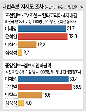 18일 칸타코리아가 조선일보·TV조선 의뢰로 지난 15~16일 전국 만 18세 이상 유권자 1010명을 대상으로 차기 대선후보 4자 대결 지지율을 조사(표본 오차는 95% 신뢰 수준에 ±3.1%포인트, 자세한 사항은 중앙선거여론조사심의위원회 참조)한 결과, 이 후보는 31.7%를 얻으며 윤 후보(32.8%)에게 1.1%포인트 차이로 밀렸다. 중앙일보·엠브레인퍼블릭이 같은 기간 1006명을 대상으로 한 조사(표본 오차는 95% 신뢰수준에 ±3.1%포인트)에서도 이 후보는 33.4%, 윤 후보 35.9%로 두 후보 간 2.5%포인트 차를 보였다. 오차범위 내 근소한 격차지만, 두 조사에서 이 후보 지지율 모두 30%대에 갇혀 있었다.