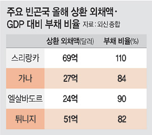 부채 위기가 가장 심각한 곳은 스리랑카로, 18일 5억 달러를 시작으로 올해 모두 69억 달러에 달하는 원리금을 갚아야 하지만 외환보유액은 16억 달러에 불과하다. 이에 스리랑카는 최근 최대 채권국인 중국에 채무 상환 일정을 조정해줄 것을 요청하기도 했다. 스리랑카와 함께 아프리카의 가나, 튀니지, 중남미의 엘살바도르 등도 채무 위기가 임박해 있다는 분석이 나온다.